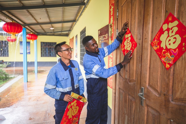 春节的脚步日渐临近,位于刚果(金)的中铁资源华刚矿业矿区内,暖意融融、欢声阵阵。中刚员工们围聚在一起,分工协作、其乐融融,贴春联、粘福字、挂灯笼、装彩灯,一道道忙碌的身影穿梭在矿区的各个角落,一张张笑脸映着喜庆的红灯笼,空气中弥漫着浓浓的年味。刚方员工们一边跟着中方伙伴忙活,一边睁着好奇的眼睛,你一言我一语地向中方员工询问着中国春节的习俗,“为什么要贴红色的春联?”“福字为什么有的要倒着贴?”“春节吃饺子是什么寓意?”一个个稚嫩的问题,一声声真诚的好奇,让现场的氛围愈发热闹亲切。