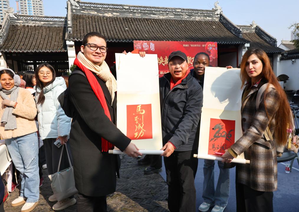 来自巴西的留学生爱德华(前左)在展示他获赠的马年主题书法作品。新华社记者 方喆 摄